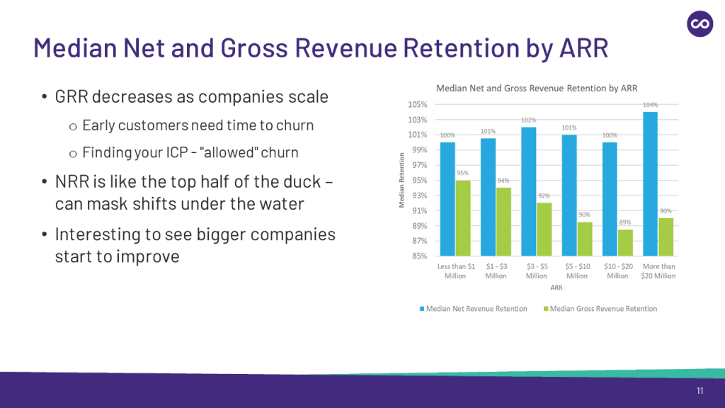 The data shows a natural decline in GRR as SaaS companies mature due to increased competition, market saturation, or product obsolescence, highlighting the broad industry reality that sustaining customer loyalty and revenue becomes progressively more difficult. In turn, this necessitates more focus on customer retention strategies for long-term business sustainability.