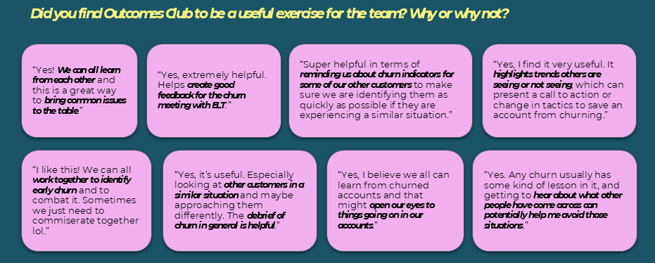 - Outcomes Club has built a new sense of camaraderie amongst the CS team. Everyone contributes and works together, strategizing on common churn themes and how to overcome them.
