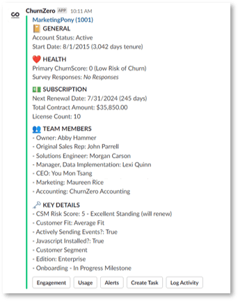 Give your entire company access to customer success data through Slack and Microsoft Teams.